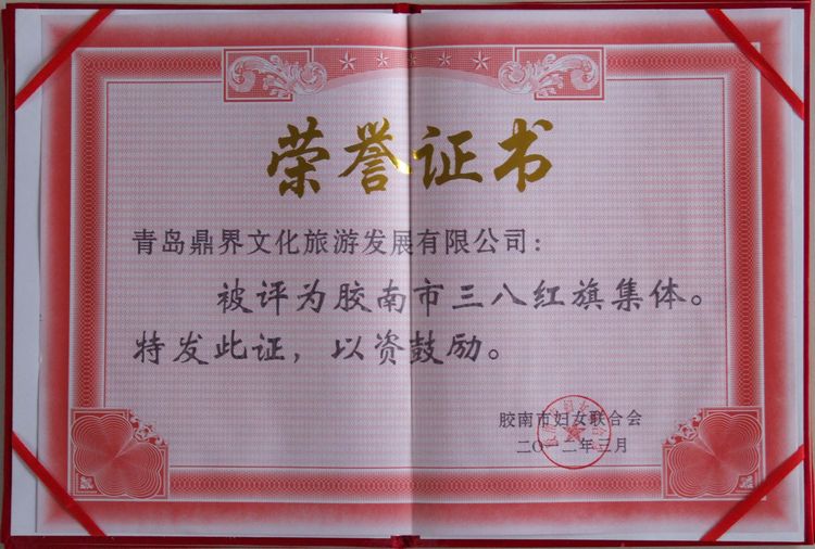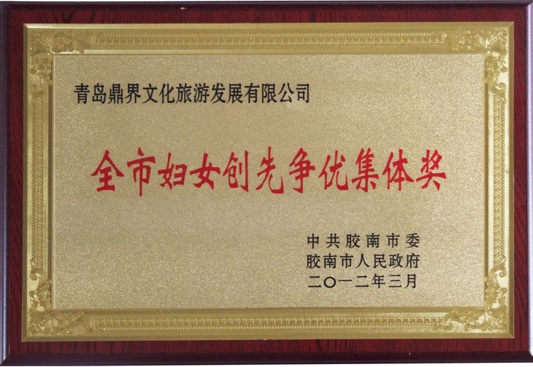 3月7日,全市紀(jì)念“三八”國際勞動?jì)D女節(jié)102周年大會隆重召開。大會授予青島鼎界文化旅游發(fā)展有限公司“全市婦女創(chuàng)先爭優(yōu)集體獎”和“膠南市三八紅旗集體”榮譽(yù)稱號。
