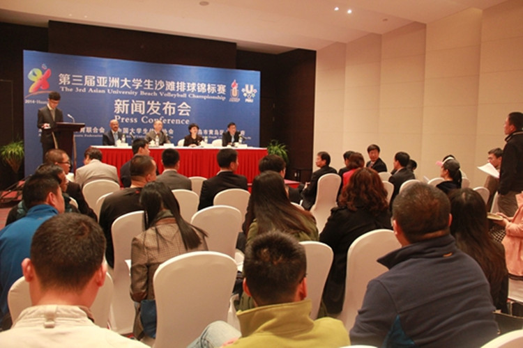 4月19日,2014年第三屆亞洲大學(xué)生沙灘排球錦標(biāo)賽新聞發(fā)布會(huì)在青島靈山灣旅游度假區(qū)城市陽臺福朋喜來登大酒店舉行。隨后,亞大體聯(lián)全部常委實(shí)地查看了比賽場地。亞大體聯(lián)主席、教育部原副部長章新勝,亞大體聯(lián)第一副主席AL-HAI Omar A,亞大體聯(lián)副主席CHEN Kunning,亞大體聯(lián)秘書長CHOW Kenny,區(qū)領(lǐng)導(dǎo)孫大貴等出席。